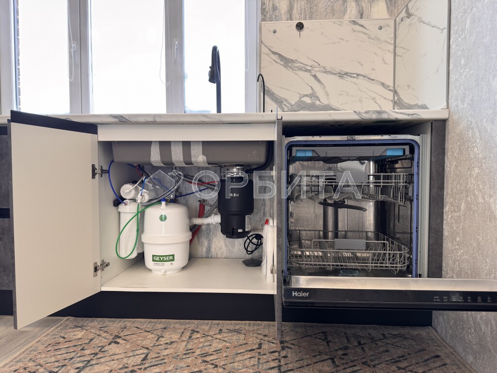 Встроенная бытовая техника: микроволновая печь, духовой шкаф, варочная поверхность, посудомоечная машина, встраиваемая вытяжка, измельчитель пищевых отходов, проточные фильтры для питьевой воды.