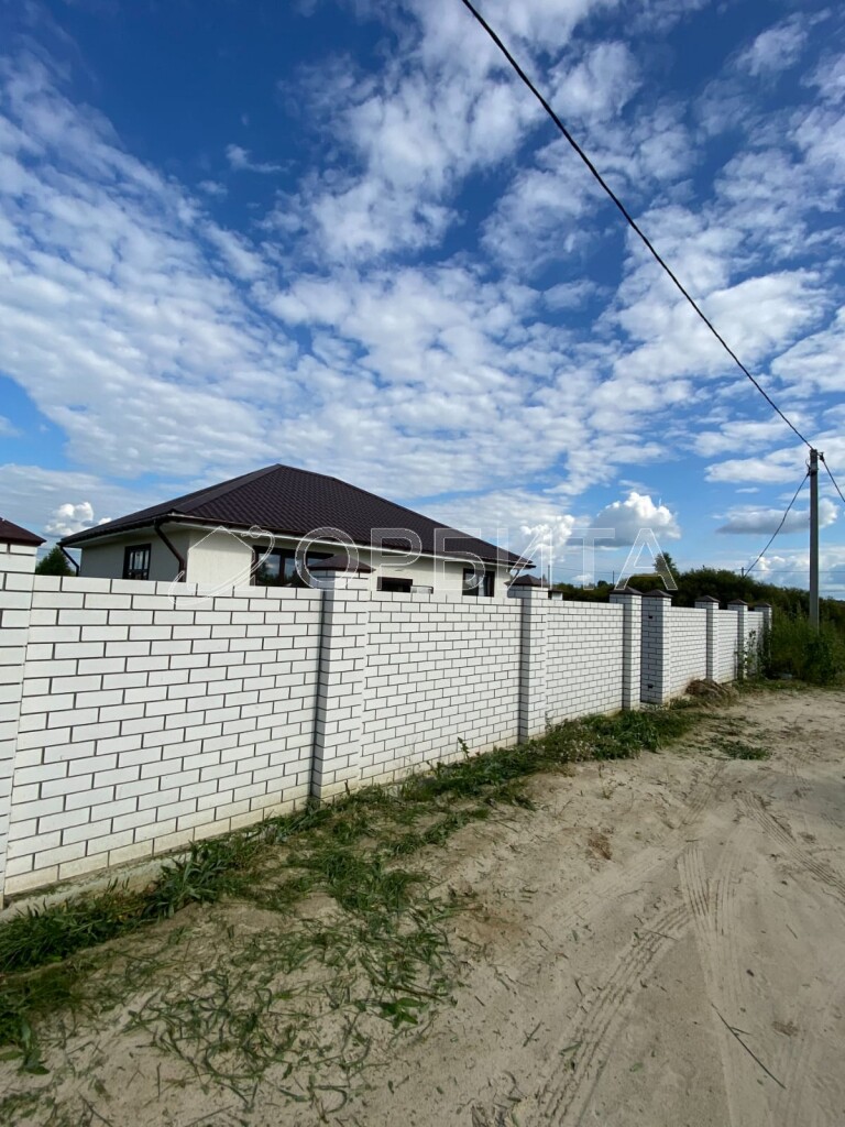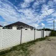 - Участок огорожен капитальным забором: лицевая сторона из белого кирпича и профнастила цвета "шоколад", остальные три стороны – профнастил цвета "шоколад" – надежная защита вашей территории.