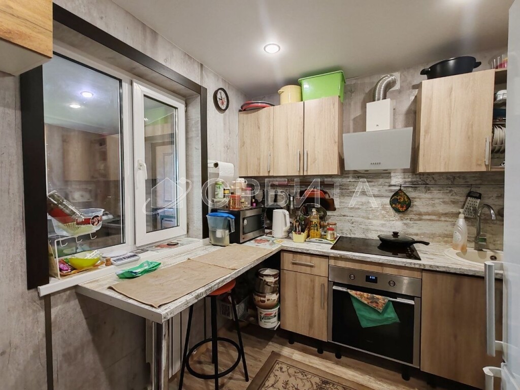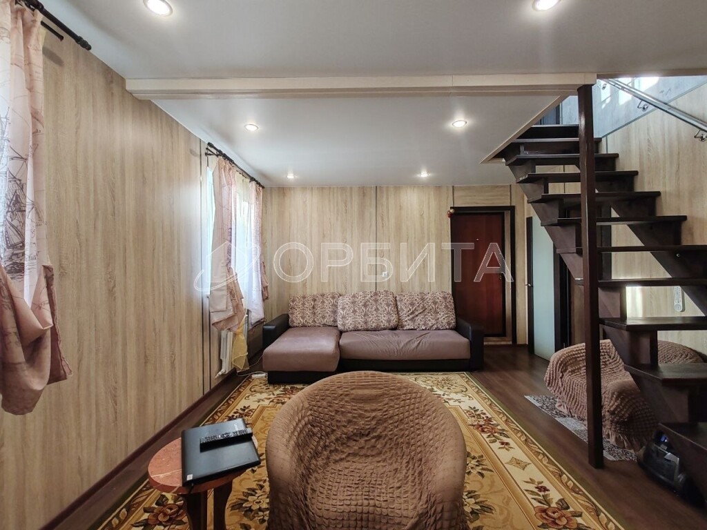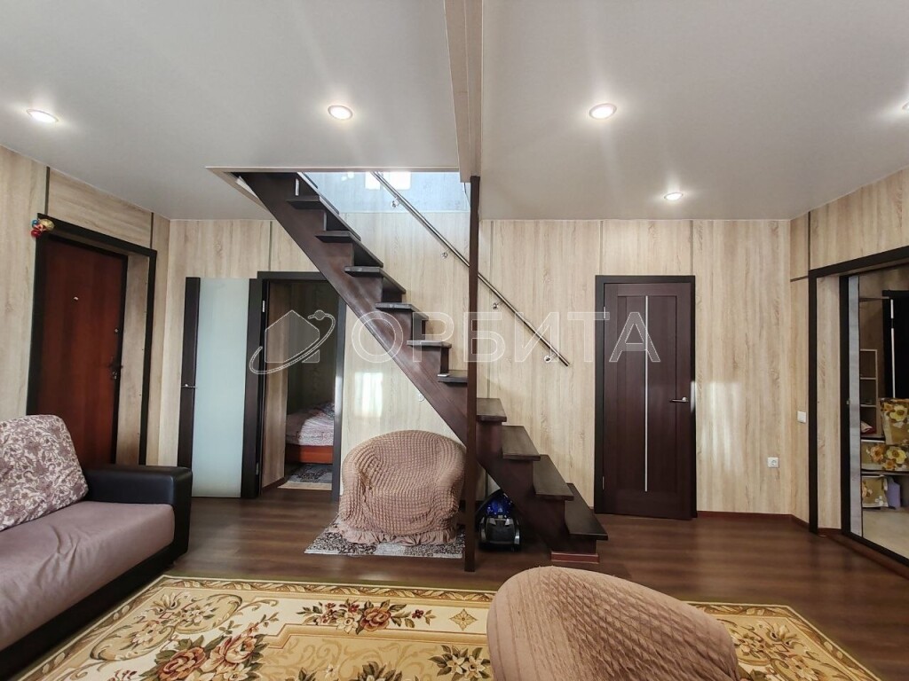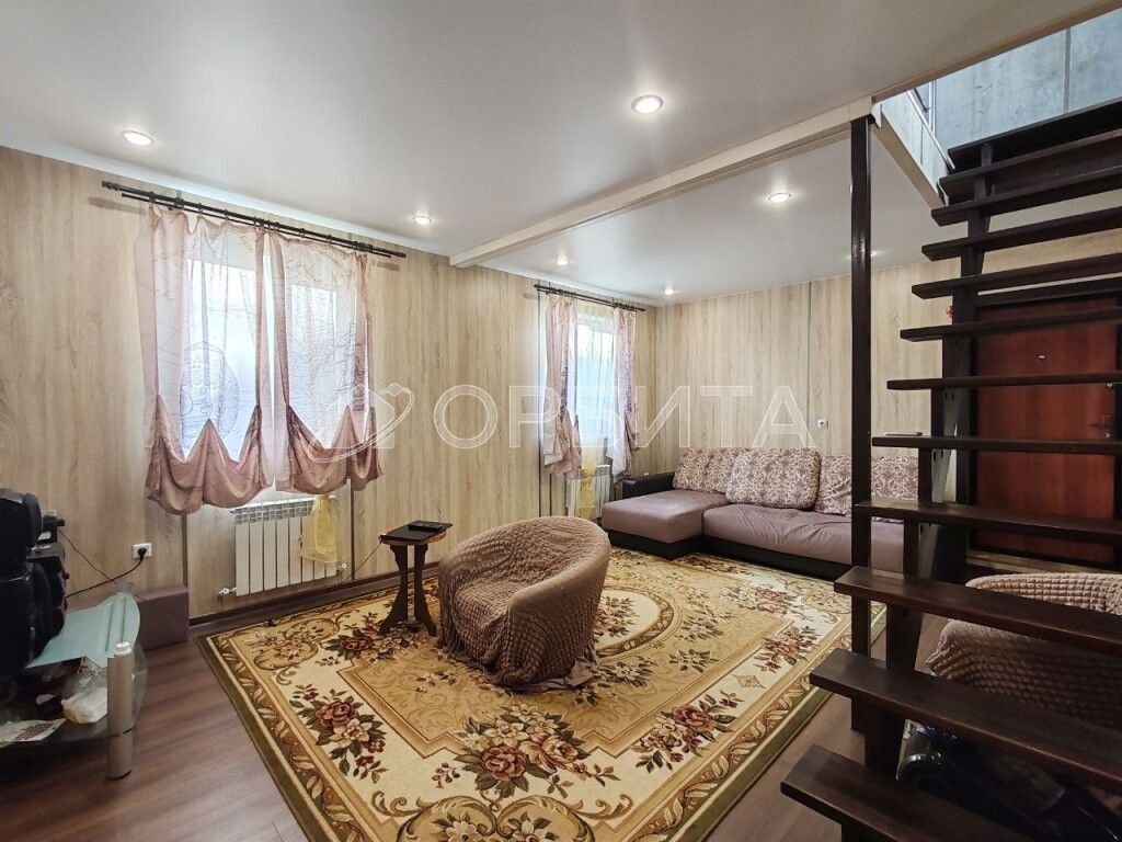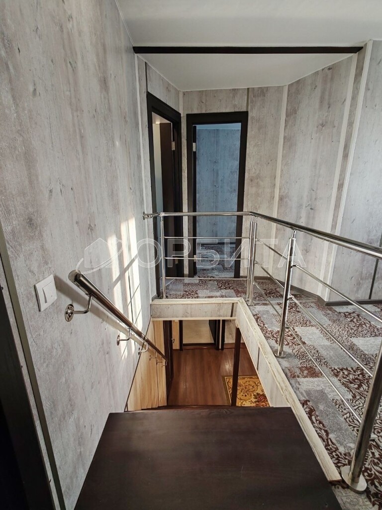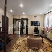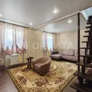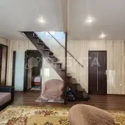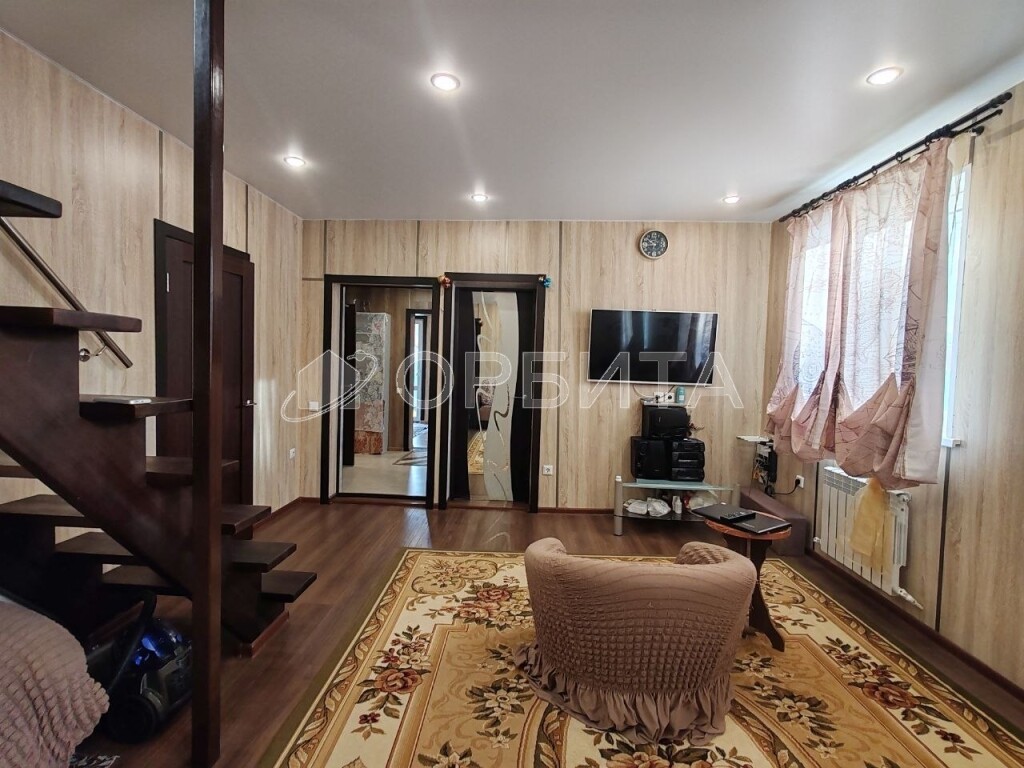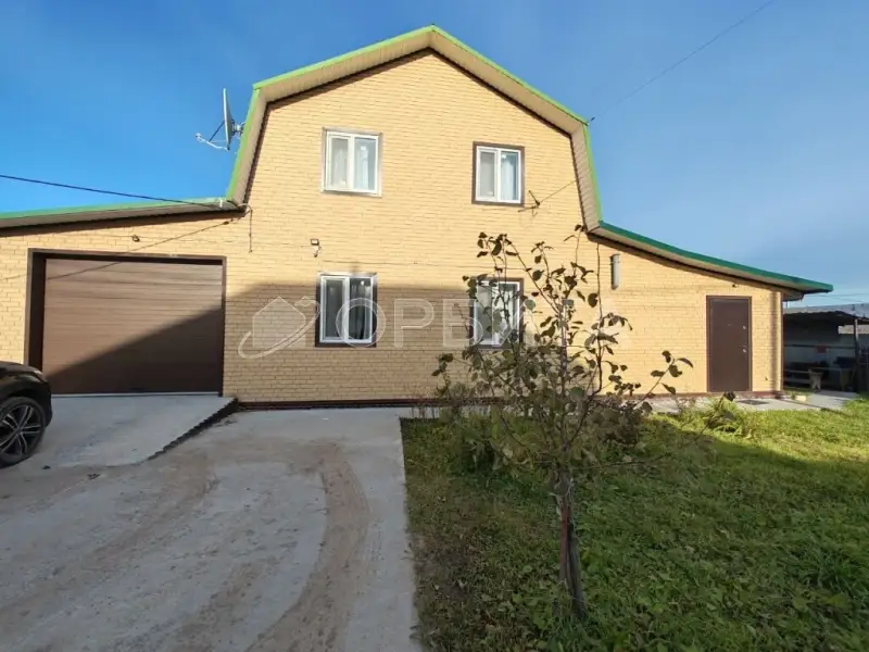 Двухэтажный дом из бруса, утепление минвата, обшит сайдингом, на участке 5 соток. Просторная планировка: на 1-м этаже гостиная, кухня, спальня и веранда; на 2-м — три спальни. Газ, отопление газ и электричество
