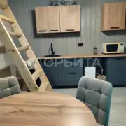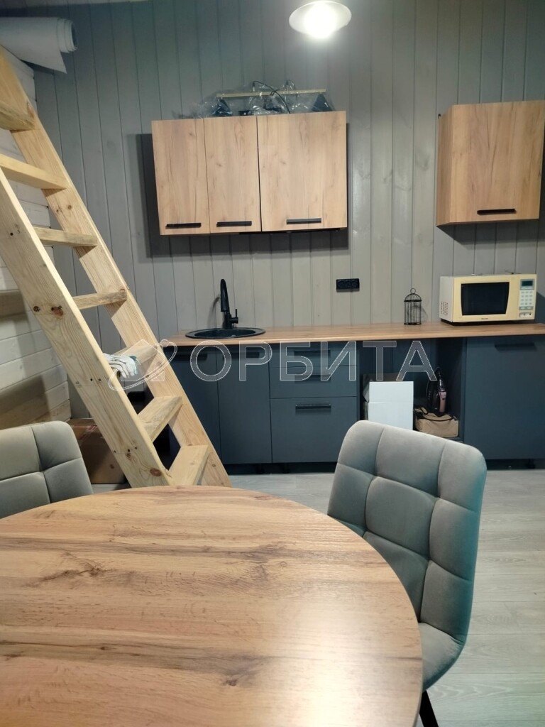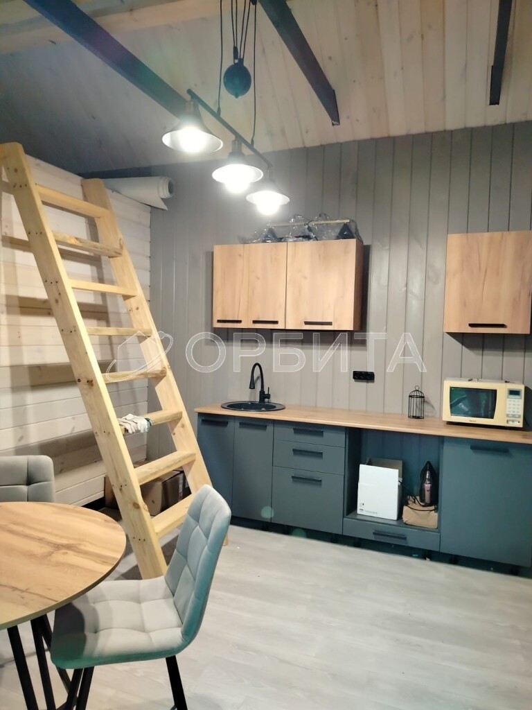 На первом этаже дома расположена уютная кухня гостиная с кухонным гарнитуром и зоной отдыха , а так же спальня с панорамными окнами, сан узел и котельная.
