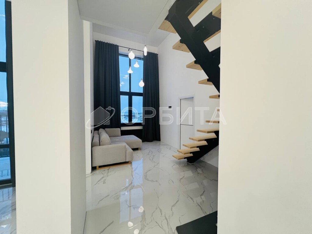 Шикарная и просторная квартира — формата хай-флэт с потолками свыше 5 метров, что дает два полноценных этажа площадью 101 кв.м и террасой 6 кв.м. Огромные панорамные окна высотой 4,5 метра.