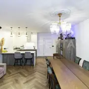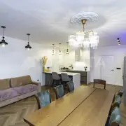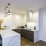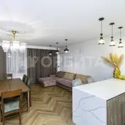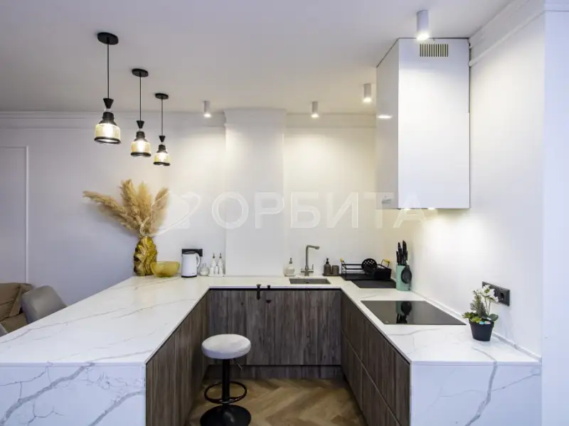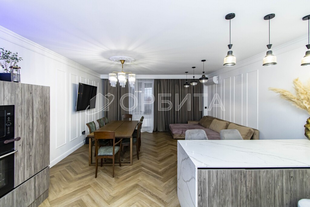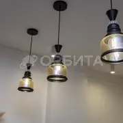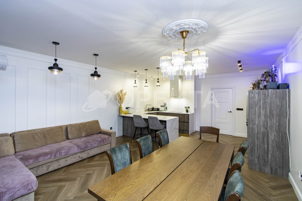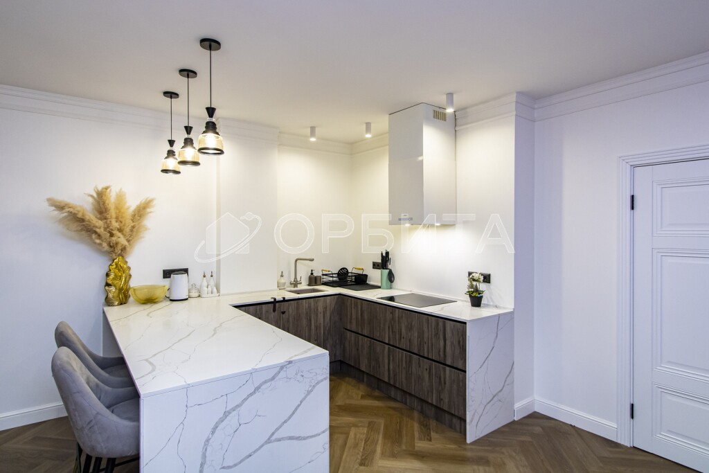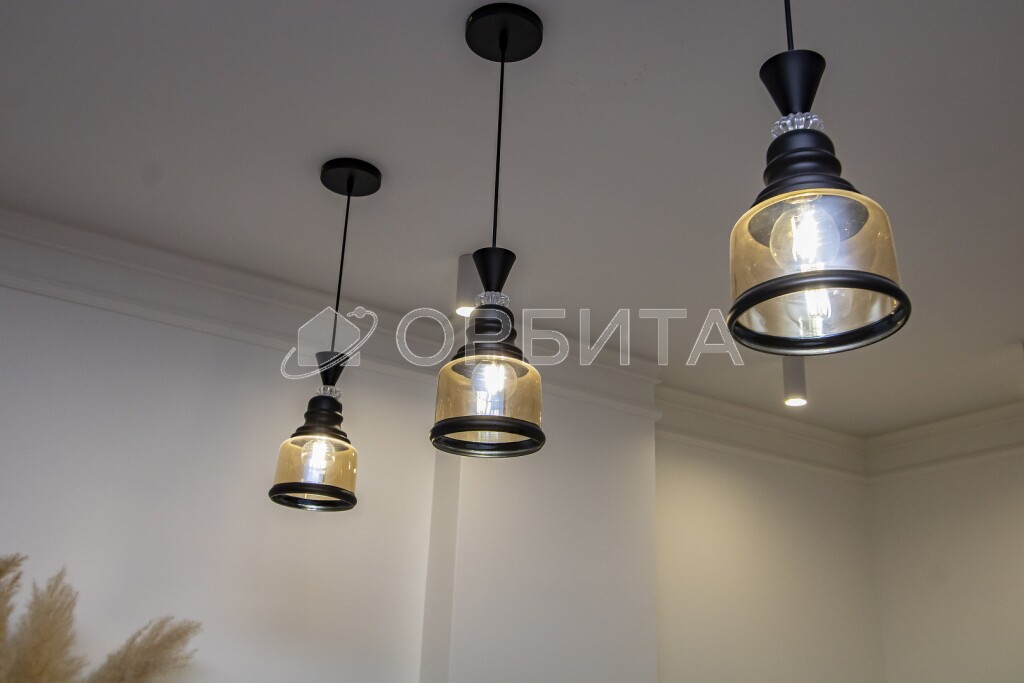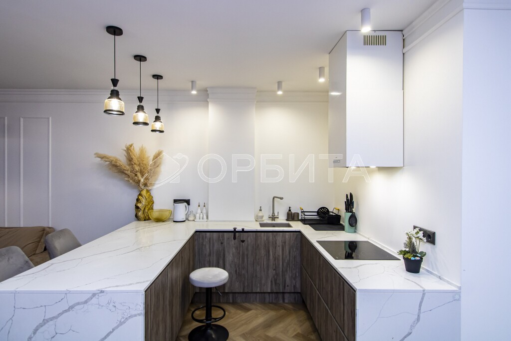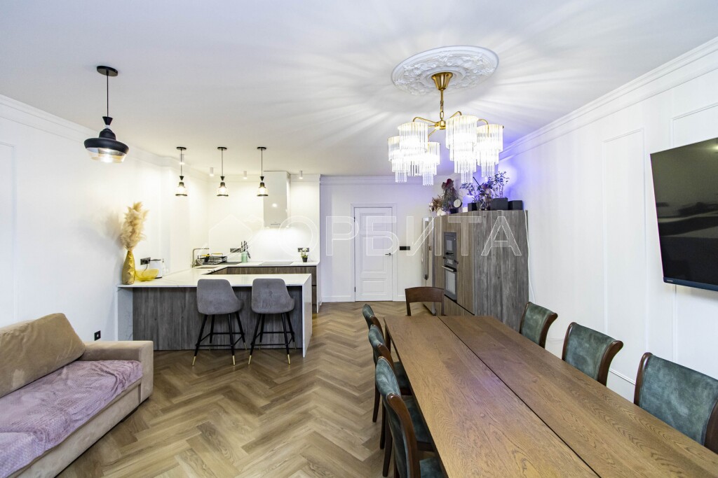 Люстры, техника, кухня производства Италия (привозили под заказ). На кухне столешница кварцевый агломерат 9м2.