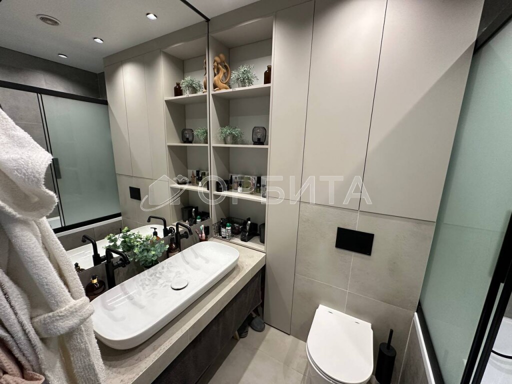 - Три точки подогрева в большом с/у: пол, стена для удобства сушки полотенец и подогрев зеркала во всю стену для исключения запотевания