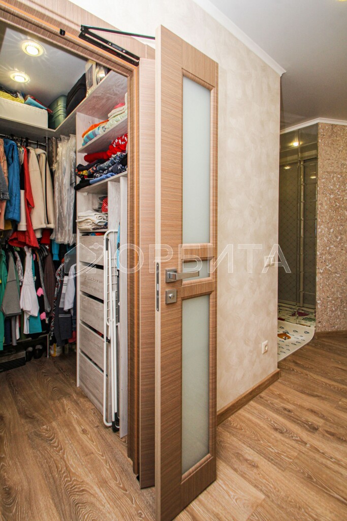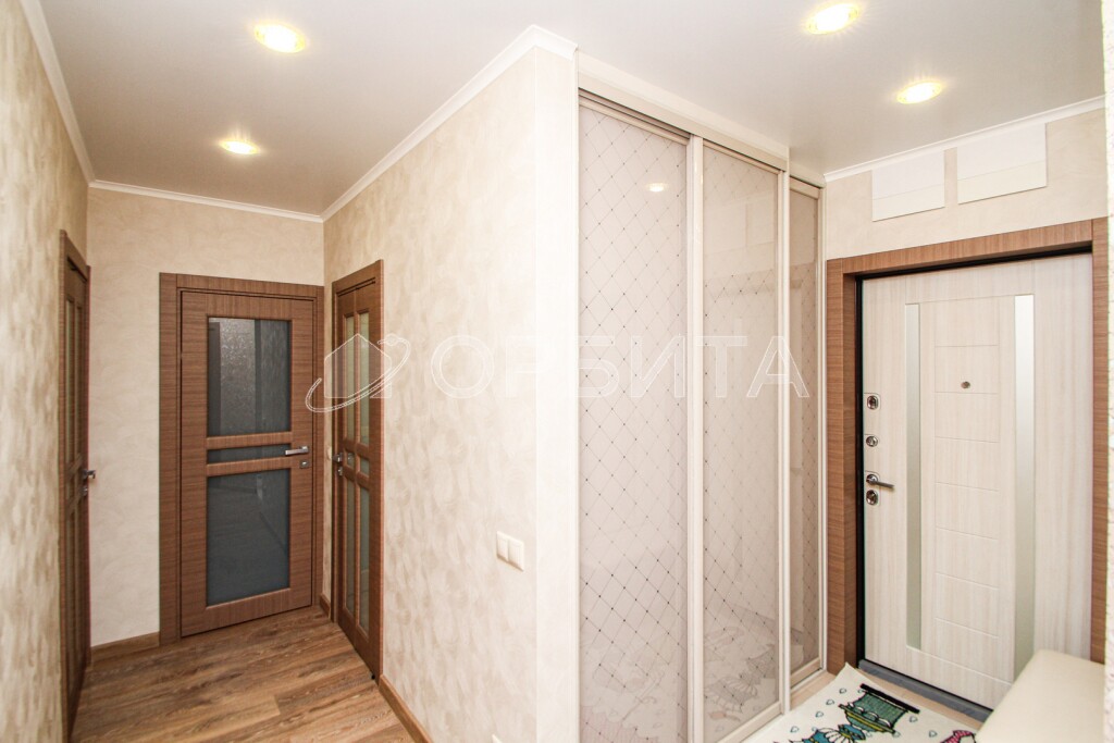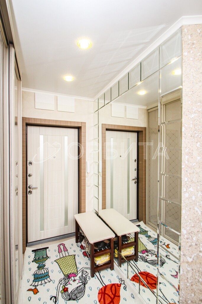 В квартире установлены стильные двери "Софья". В прихожей — вместительный красивый шкаф.