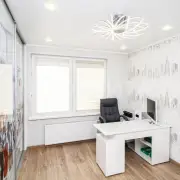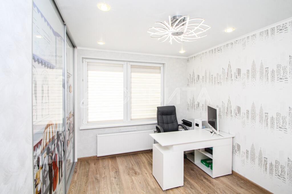 • Кабинет с оригинальным шкафом-купе и белоснежным угловым письменным столом.