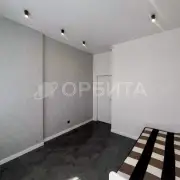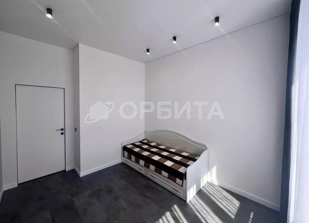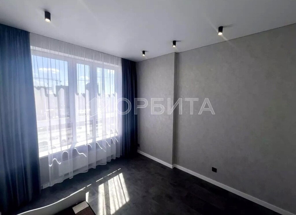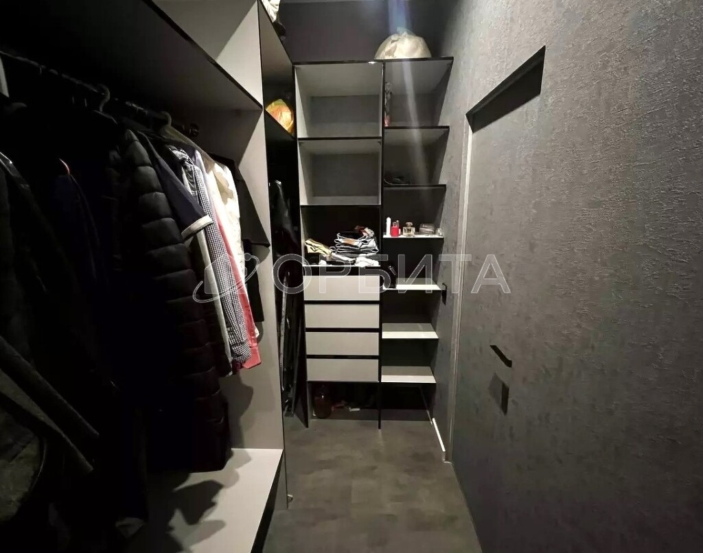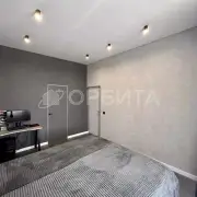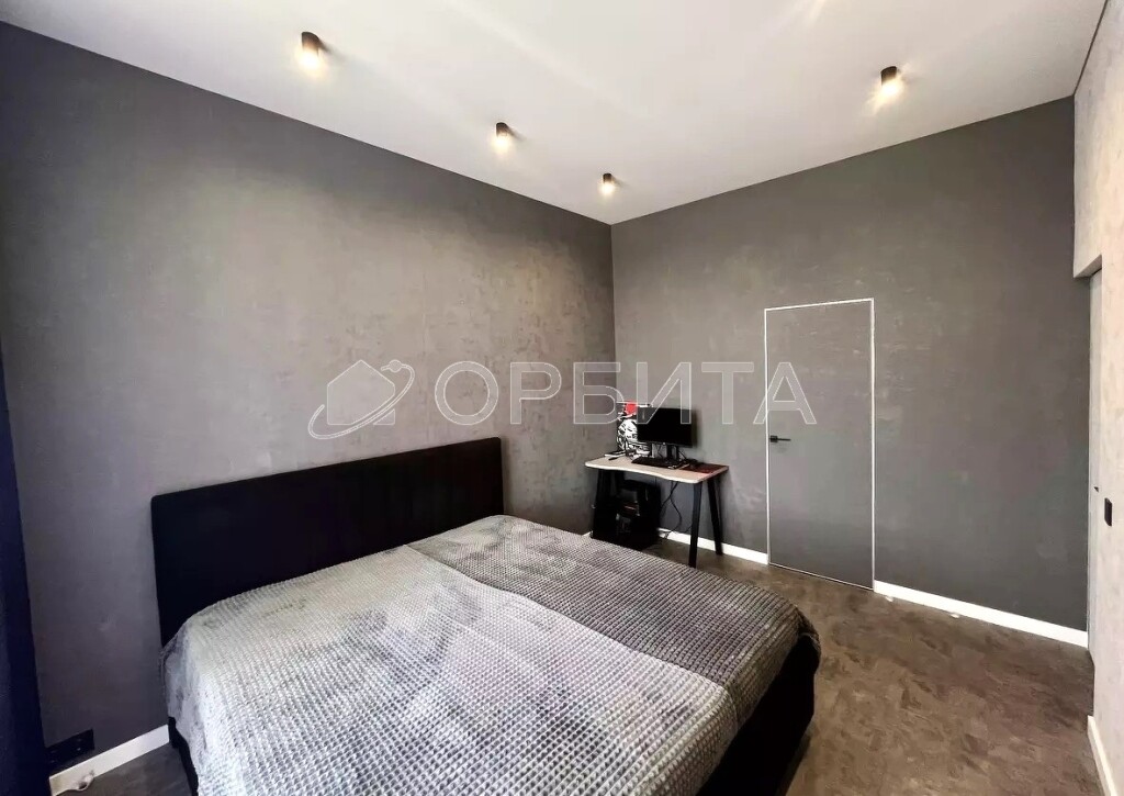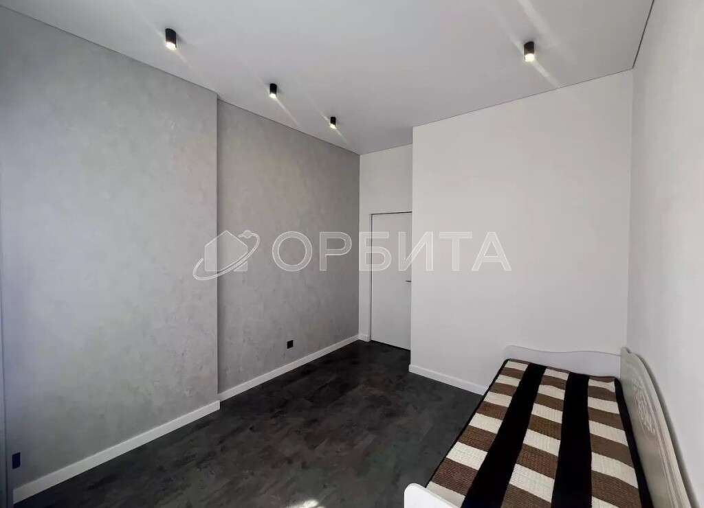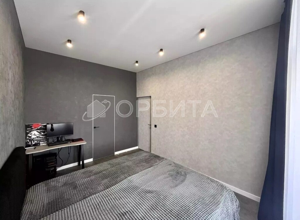 - Стены — фактурные обои; потолки — натяжные. Всё выполнено в единой, выдержанной палитре.