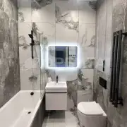 - Пол: керамогранит в прихожей, ванной и гостиной — практично и стильно.