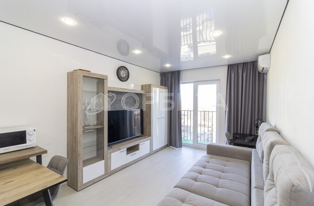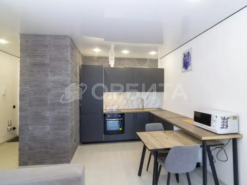 • Обставлена современной мебелью и техникой: кухонный гарнитур с бытовой техникой (холодильник, варочная панель, духовой шкаф, вытяжка, посудомоечная машина), обеденная зона, диван, телевизор, двуспальная кровать, кондиционер, шкаф и система хранения.